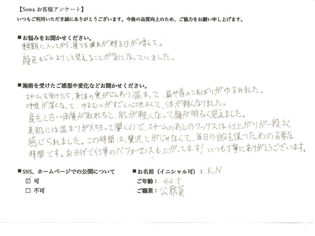 スチームを受けたら、身体の奥がじんわり温まって、肩や首のこわばりがゆるみました。呼吸が深くなって、ゆるむのがすごく心地よくて、体が軽くなりました。