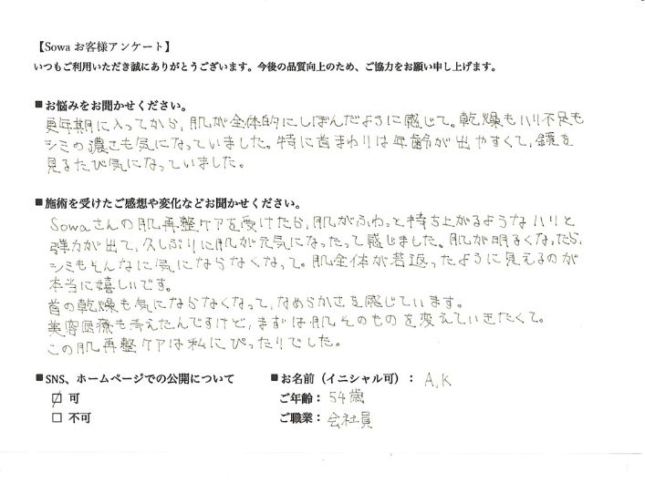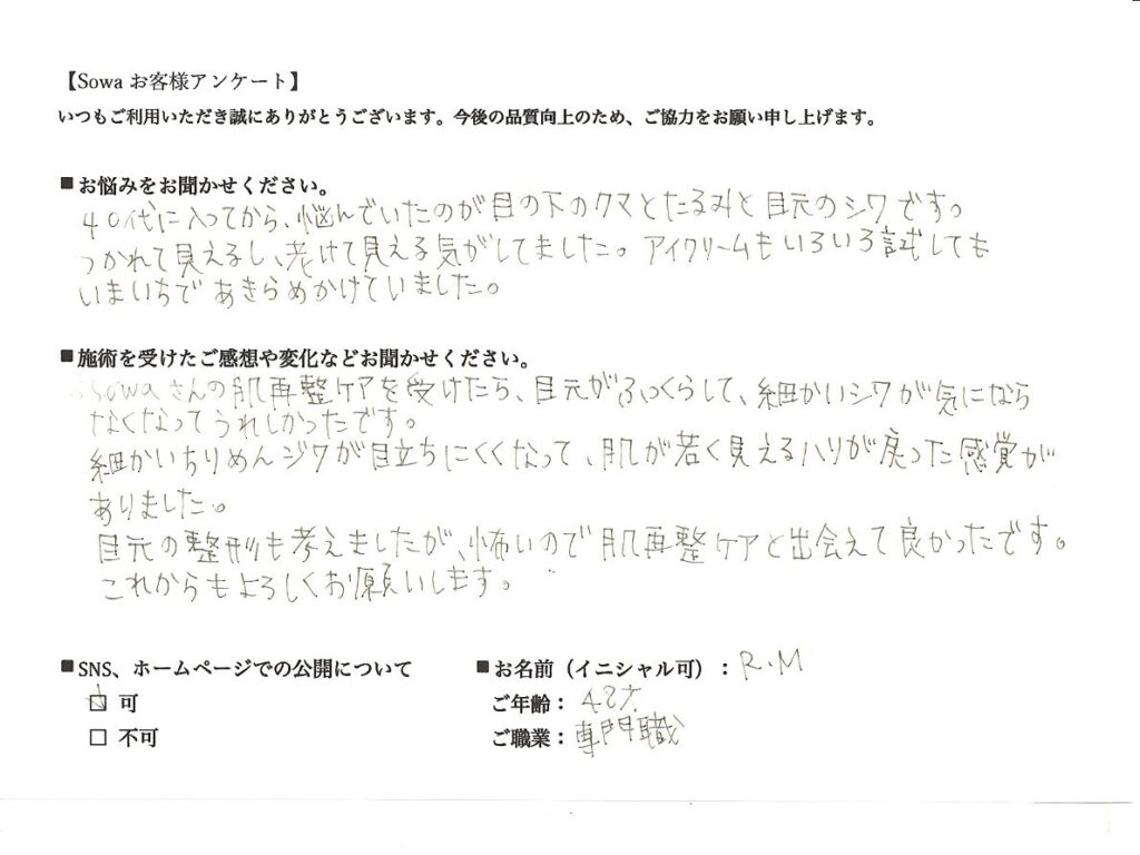 Sowaさんの肌再整ケアを受けたら、目元がふっくらして、細かいシワが気にならなくなって嬉しかったです。