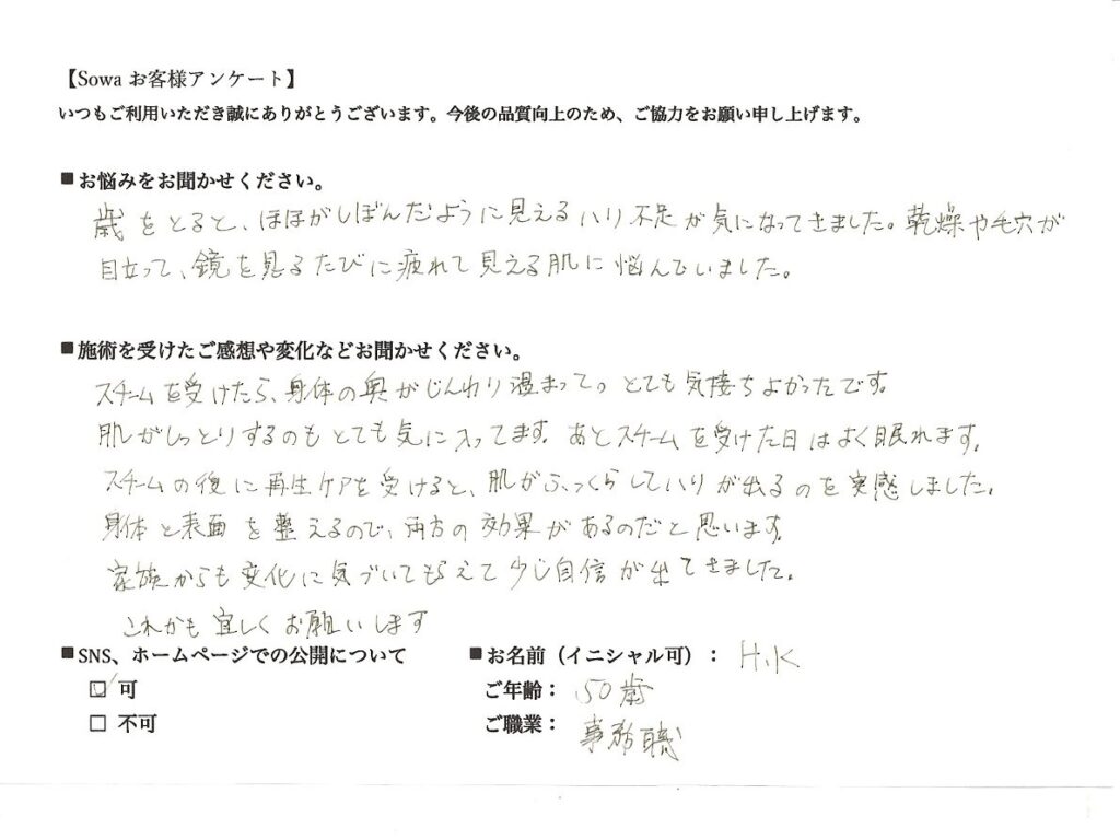スチームの後に再生ケアを受けると、肌がふっくらしてハリが出るのを実感しました。